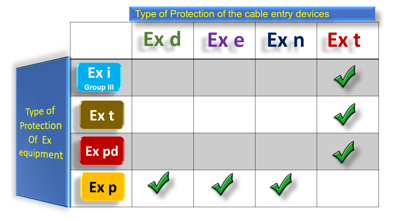 IEC 60079-14 -Edition 6 gives a table for the selection of Glands (IEC is using a general term “cable entry devices”) according to protection techniques , as given in different sections of the same standard.